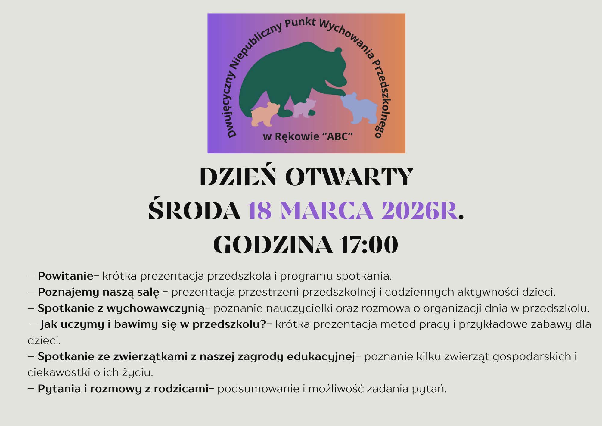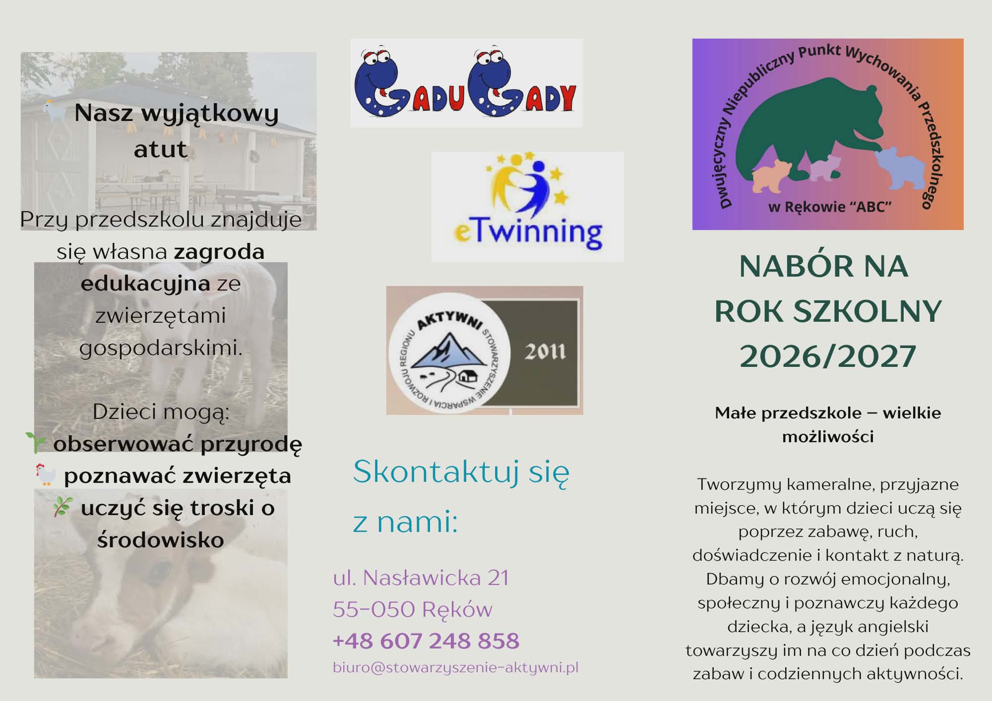 Szanowni Państwo, z radością informujemy, że od 1 września 2026 roku nasza placówka w Rękowie rozpoczyna nowy etap rozwoju. Zmianie ulega zarówno profil, jak i nazwa Niepublicznego Punktu Wychowania Przedszkolnego. Od nowego roku szkolnego będziemy funkcjonować jako: „ABC” Dwujęzyczny Niepubliczny Punkt Wychowania Przedszkolnego w Rękowie. Wprowadzamy rozszerzony program dwujęzyczny, w